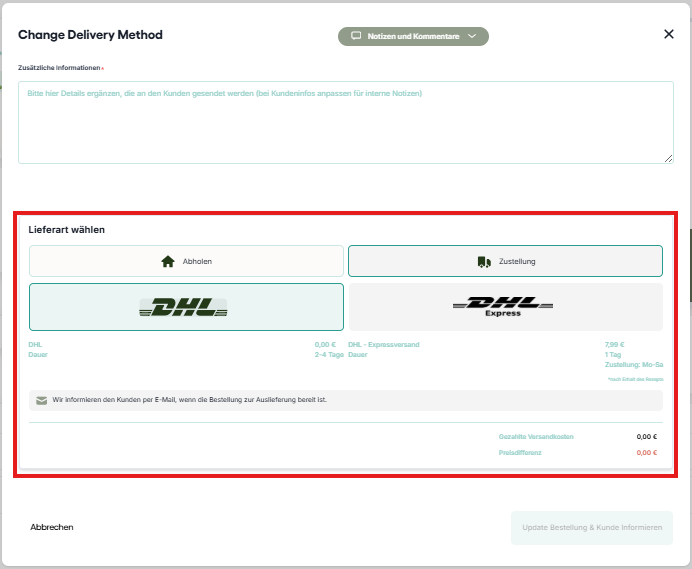 Abschließend muss ein Kommentar im Feld "Zusätzliche Informationen" hinterlegt werden, um die geänderte Zustellmethode mit klick auf "Update Bestellung & Kunden informieren" zu speichern.